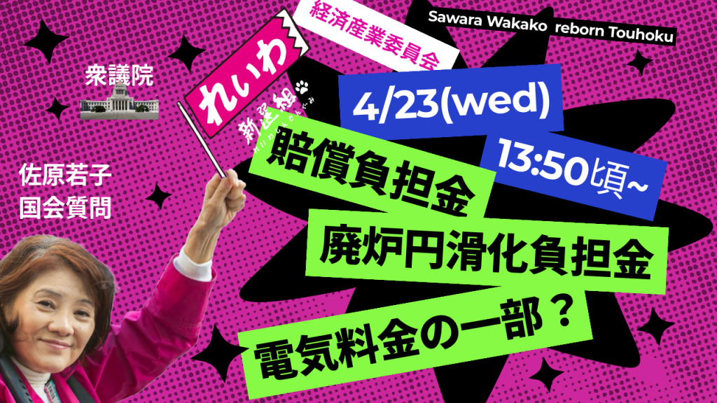 ○佐原委員れいわ新選組、佐原若子です。今日は、質問の機会をありがとうございます。まず、質問に先立ち、今、福島第一原発では、核燃料デブリの取り出しに多くの方が関わっています。政府は、この現状をしっかり把握し、現場で働く方々の命と生活の安全をしっかり守っていただきたいと思います。私たちが知らない現場で危険な任務に当たられている方々に心から敬意を表します。では、質問させていただきます。四月十一日の委員会で資源エネルギー庁から御説明をいただいた電気託送料金について詳しくお尋ねします。賠償負担金及び廃炉円滑化負担金については、託送料金を通じて広く需要家に負担を求める措置を講じているということでした。資源エネルギー庁のホームページの廃炉円滑化負担金の解説に、二〇一八年七月閣議決定のエネルギー基本計画で示されている原発依存度の低減というエネルギー政策の基本方針の下、円滑な廃炉を促すために原子力発電所の廃炉に伴って一括して生じる費用を分割計上する費用として、電気料金の一部として需要家から受け取りますとあります。原発依存度の低減というエネルギー政策の下で負担金を消費者から受け取っているという認識で間違いありませんか。昨年閣議決定されたエネルギー基本政策の内容は、二〇一八年のものとは変わっている点があります。消費者から今も負担金を受け取っているということは、昨年決定のエネルギー基本政策の内容と矛盾はないと認識してよろしいですか。
